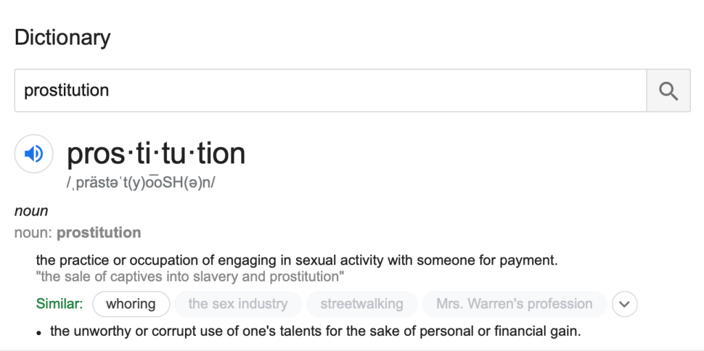The Oxford-English Dictionary defines prostitution as the practice or occupation of engaging in sexual activity with someone for payment. Prostitution is illegal in the United States and according to Kiss, if you are a juvenile engaging in prostitution you are automatically considered to be trafficked in the state of Georgia.