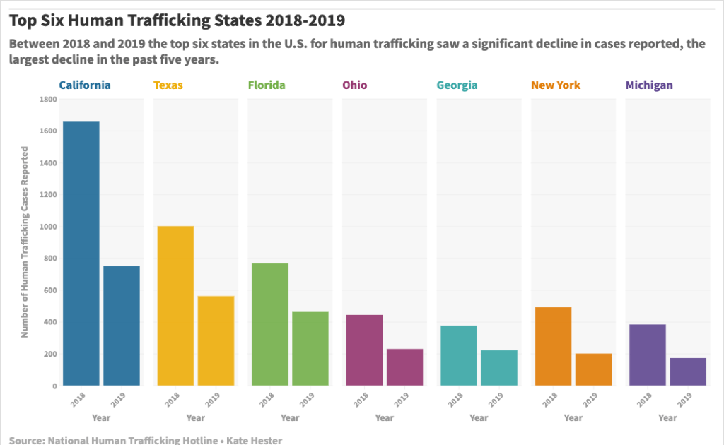 Georgia is one of the top six states for reported human trafficking cases, with 1,346 cases reported from 2015-2019. However, the data collected by the National Human Trafficking Hotline shows that there was a significant decrease in reported cases from 2018-2019. California, the state with the largest number of cases reported, dropped from 1,656 to 749 and Georgia dropped from 375 to 222 reported cases.