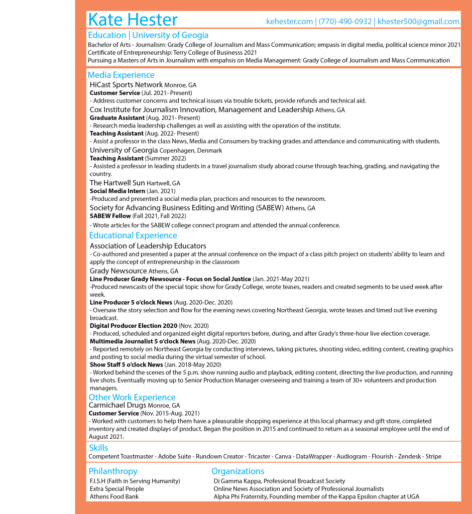 Resume kh_resume_september_2022_digitalversionDownload email: khester500@gmail.com | phone: (770)-490-0932 | linkedin: Kate Hester Share this: Share on X (Opens in new window) X Share on Facebook (Opens in new window) Facebook Like Loading...